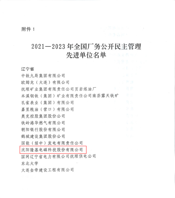 近日,全國廠務公開協調小組下發《關于表彰2021—2023年全國廠務公開民主管理工作先進單位的決定》。沈陽隆基電磁科技股份有限公司榮獲2021—2023年全國廠務公開民主管理先進單位。